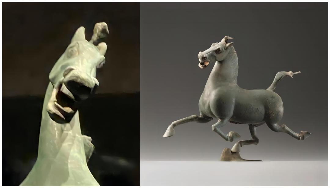 很显然,右图才是甘肃省博物馆官方图片据甘肃省博物馆介绍,铜奔马于甘肃省武威市雷台汉墓出土,塑造者选取了奔马三足腾空、一足超掠飞鸟的刹那瞬间。
