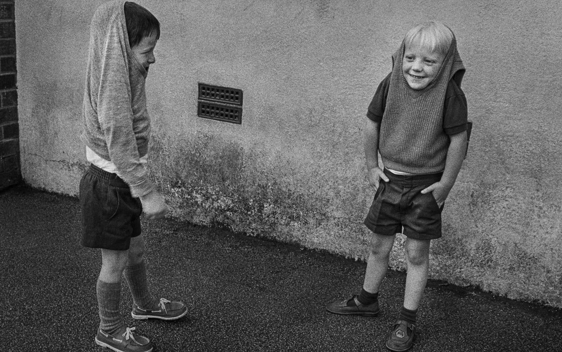 如何穿衣:利物浦布克大道小学的两个男孩,1988。