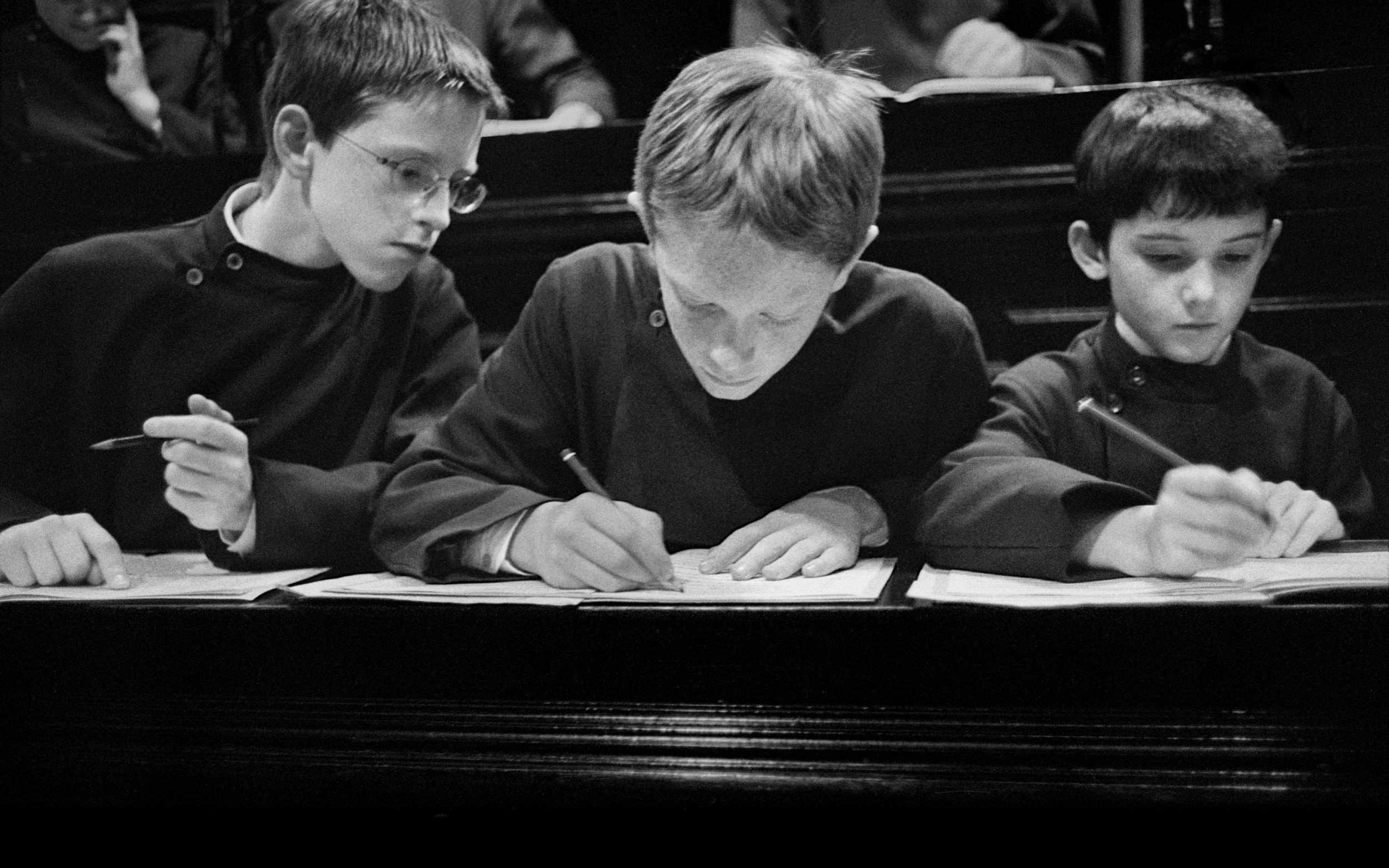 在达勒姆大教堂排练的三名唱诗班成员,2000。