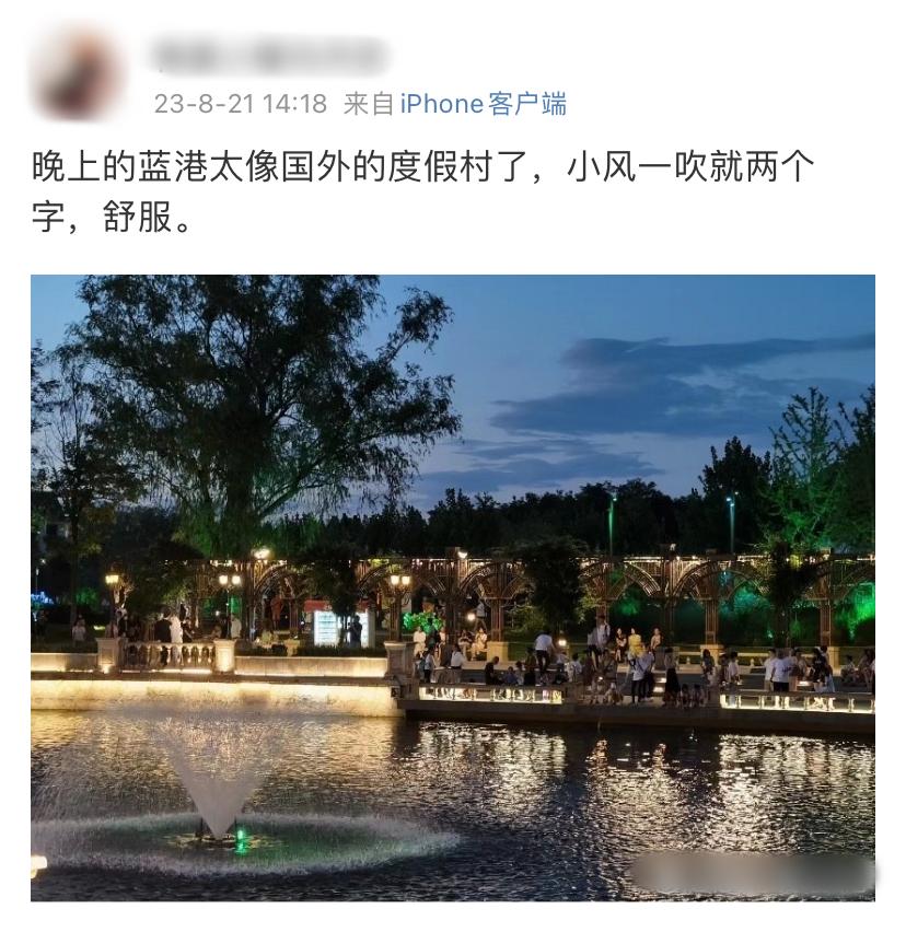 “如果说亮马河的chill是时髦人的专属,朝阳公园是有钱有闲年轻人的放空基地,蓝港的‘假装度假’,则平等地接受所有普通人。”