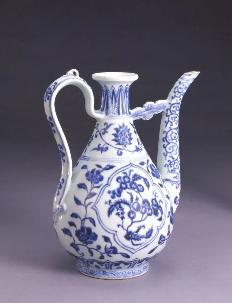 此壶造型端庄古朴,釉质肥厚莹润,青花色泽深沉含蓄,色重处青花下凹,呈现出点点的黑疵斑痕,与浓艳的青色相映成趣,形成独特的艺术效果。宣德时期使用进口的“苏泥勃青”料,烧成后的青花色泽浓重艳丽,深入胎骨,为宣德青花的显著特征。