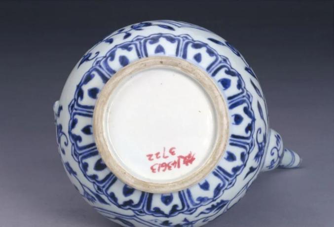 此葫芦扁壶为明永乐时景德镇御窑厂的创新器形,宣德朝继续烧造,品种有白釉、青花等,造型与纹饰皆仿自西亚伊斯兰工艺品。明永乐朝制品不署年款,宣德制品一般则署年款。