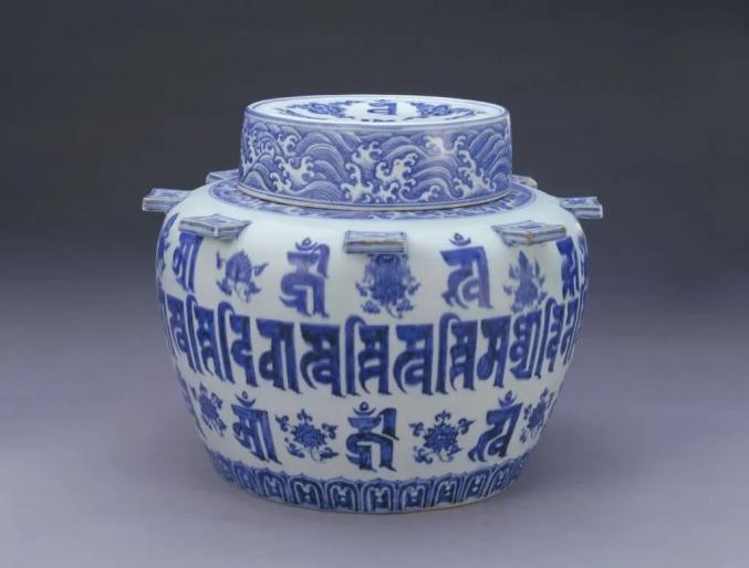 罐直口,丰肩,硕腹,平底。口上有凹槽。肩部有8个长方形出戟。胎体厚重。釉色青白。青花浓艳并有黑疵。通体以青花为饰。罐身分层绘海水、八吉祥、蓝查体梵文及莲瓣纹。罐附圆盖,盖面中央书一蓝查体梵文,周边绘4朵云纹,间以4个蓝查体梵文。盖之外壁饰海水纹。盖内顶面双线圈内绘一周9个莲瓣,每个莲瓣内均书一蓝查体梵文,中央双线圈内横书“大德吉祥场”五个篆体字,与罐内底面同样的五字相对应。