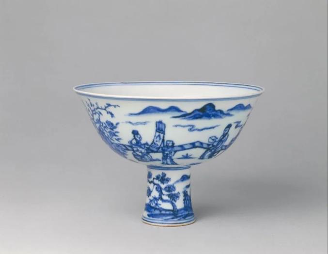 5.青花人物纹高足碗明宣德,高10.2厘米,口径15.5厘米,足径4.5厘米。