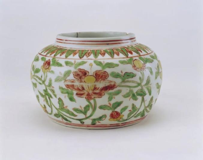 五彩殊为少见,传世品中有少量的盘、碗、罐等器,此罐虽残破锔补,但国内仅有1件,倍加珍贵。