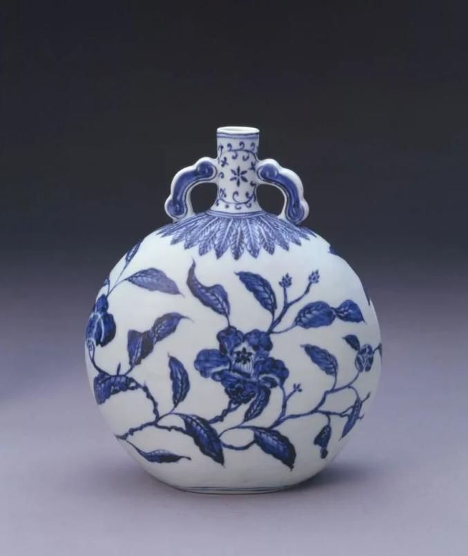 花卉题材在明代宣德瓷器装饰中占据主导地位,其中石榴花、菊花、莲花、茶花、牡丹、百合、宝相花、牵牛花等较为常见。每种器物多由2种、4种、6种或更多种类花卉通过不同形式组合在一起,形成变化丰富的花纹装饰。除花卉组合使用,也流行以单独花卉为饰,此件扁壶即为一例。其腹部两面各绘茶花一枝,笔触细腻,图案写实,别有一番情趣。