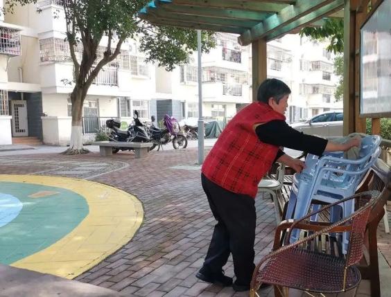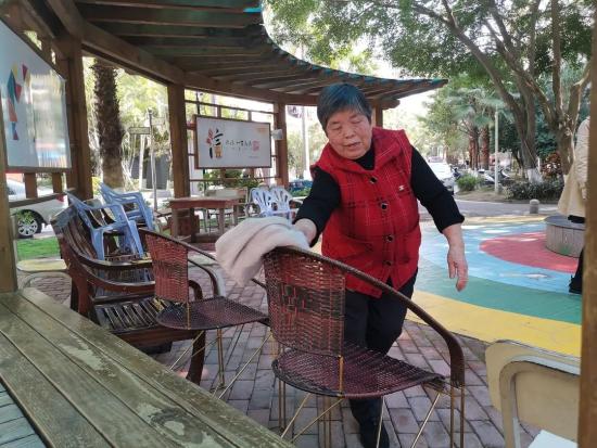 每天早上五六点,她只要在家都要先去小广场,擦掉桌椅上的尘土雨水,扫去地面上的枯枝落叶,遇上连绵的阴雨天,她一天要擦上两三回。这个小小的举动她坚持做了14年,她就是77岁高龄的黄亚丽阿嬷。年轻时落下的残疾,使她行动多有不便,但她每天坚持做着力所能及的“小事”。小区是“家”