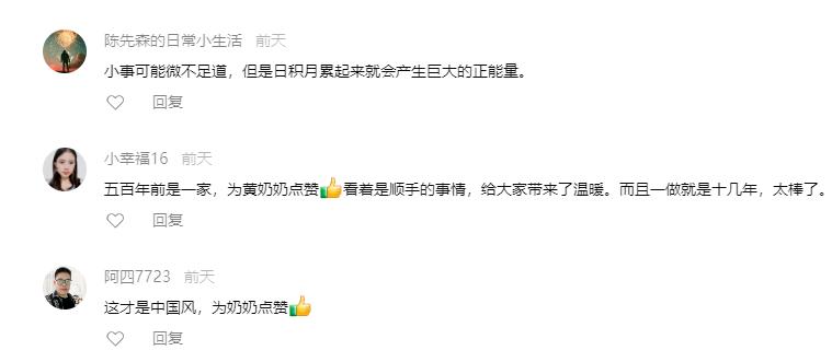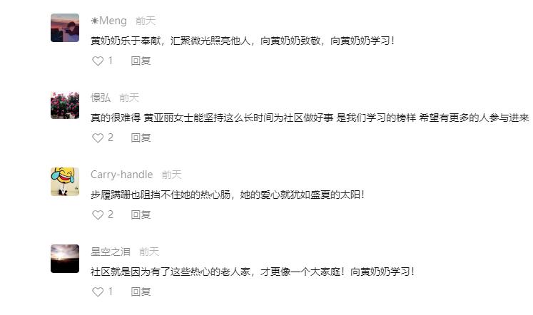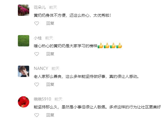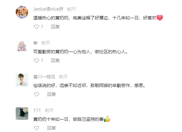 hikari:老奶奶十年如一日的坚持做好事,看起来微不足道,但是却很暖心,如果大家都跟她一样,我们的生活环境肯定很好很好呢。山间月:家有一老,如有一宝,那么大的年纪不在家享清福,还出来帮邻居做善事,真的很让人感动。