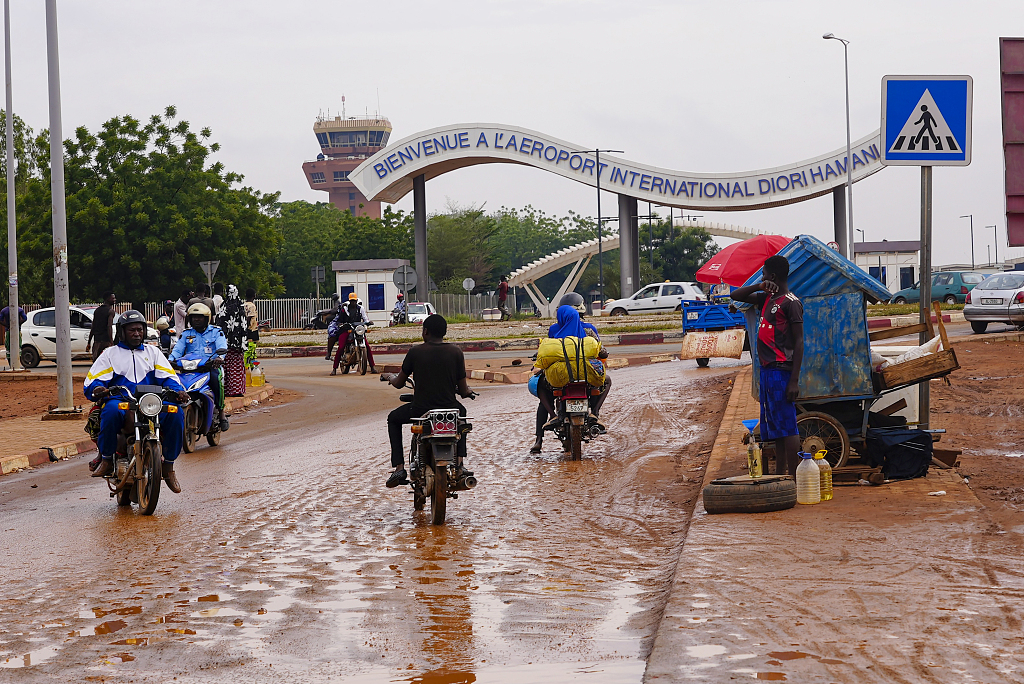 当地时间2023年8月8日,尼日尔尼亚美,摩托车手在尼亚美机场入口处骑行。视觉中国 资料图