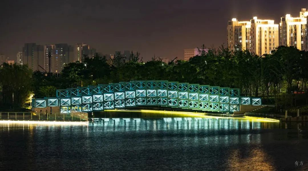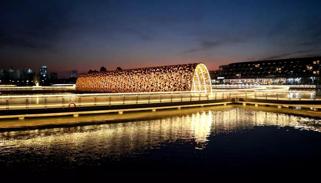 蓝色的四号桥为有顶单拱桥以近乎无障碍的坡度“鱼跃”过湖面