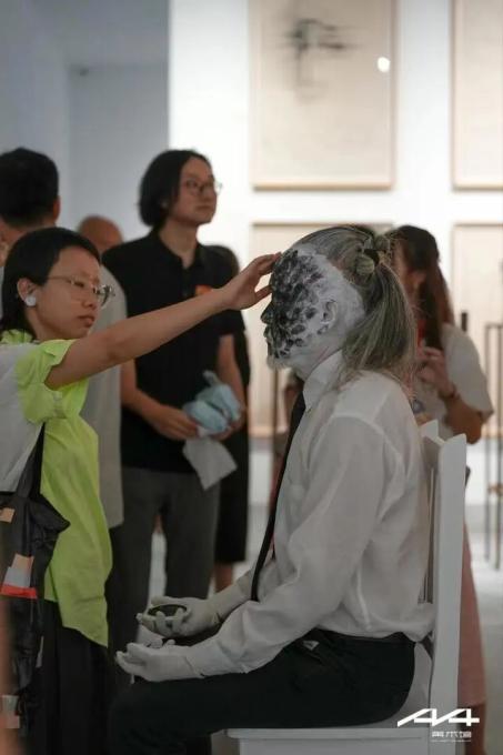 参展艺术家戴光郁现身A4美术馆三楼展厅,为观众带来了一场行为艺术——作品《你来过》。作为西南前卫艺术的发动者与组织者之一,戴光郁总是以不拘一格的自由风格引发观众更深度的思考,表演中,他邀请了观众在他纯白的面孔上印上黑泥的痕迹。这个行为艺术的最终影像版将会作为戴光郁老师的作品之一,在本次“感知地理”的展览中呈现。
