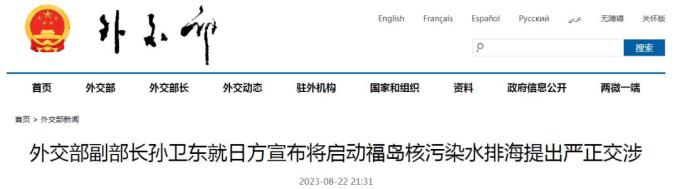 2023年8月22日,外交部副部长孙卫东召见日本驻华大使垂秀夫,就日本政府宣布将于8月24日启动福岛核污染水排海提出严正交涉。
