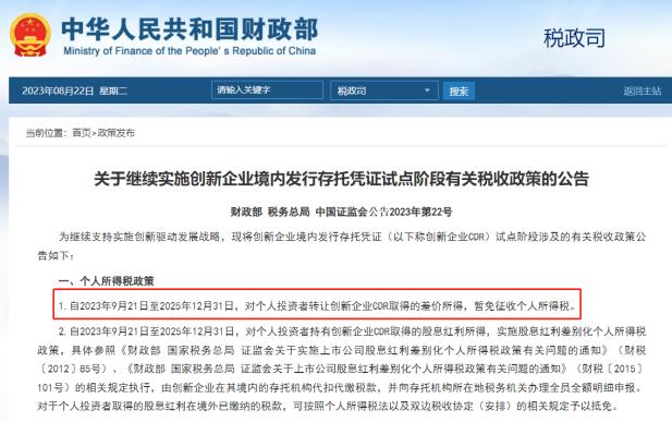 个人转让创新企业CDR暂免征收个人所得税