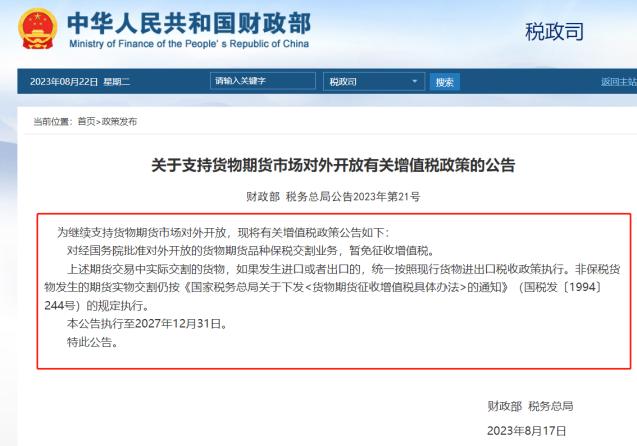 财政部、税务总局公告称,为继续支持货物期货市场对外开放,对经国务院批准对外开放的货物期货品种保税交割业务,暂免征收增值税。