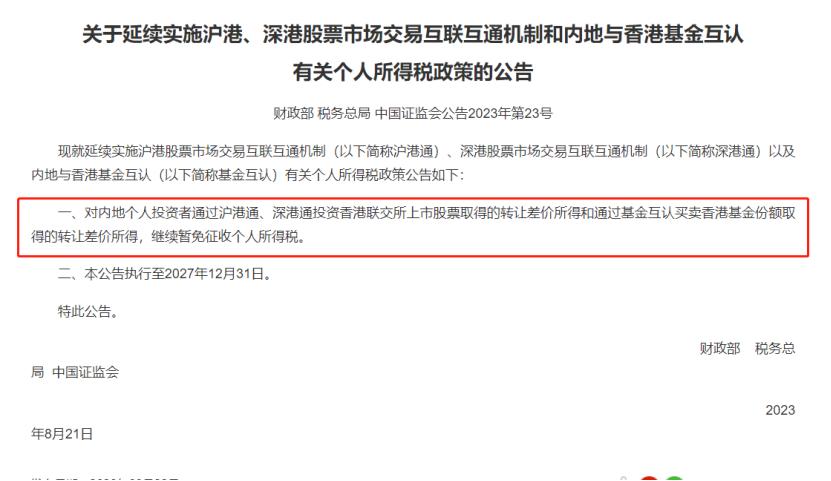 内地个人投资者沪港通、深港通投资交易继续免征个税三部门公告称,延续实施沪港通、深港通以及内地与香港基金互认(以下简称基金互认)有关个人所得税政策,对内地个人投资者通过沪港通、深港通投资香港联交所上市股票取得的转让差价所得和通过基金互认买卖香港基金份额取得的转让差价所得,继续暂免征收个人所得税。