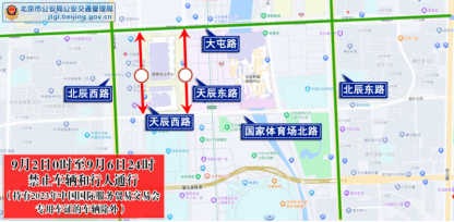 (二)9月2日0时至9月6日24时,天辰东路由国家体育场北路与天辰东路交叉口(不含)至大屯路与天辰东路交叉口(不含)南向北方向、天辰西路由国家体育场北路与天辰西路交叉口(不含)至大屯路与天辰西路交叉口(不含)南北双方向,禁止车辆和行人通行。途经车辆和行人可经北辰东路、北辰西路、大屯路绕行。