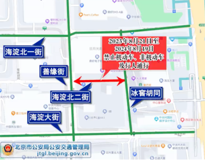 为保证鼎好电子大厦B座升级改造项目施工期间的道路交通安全与畅通,根据道路交通安全法律法规有关规定,决定2023年8月21日至2024年8月19日,海淀区海淀北二街(海淀北二街与善缘街相交路口至海淀北二街与冰窖胡同相交路口)禁止机动车、非机动车及行人通行,过往车辆及行人可绕行善缘街、海淀北一街、海淀大街、冰窖胡同等周边道路通行。通州区紫运中路