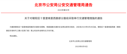 为保证西城区天宁寺地区道路交通安全和畅通,根据道路交通安全法律法规有关规定,决定自2023年8月28日起,天宁寺街(天宁寺南门至天宁寺东里段)禁止机动车由东向西方向行驶。朝阳区十里堡南里西路