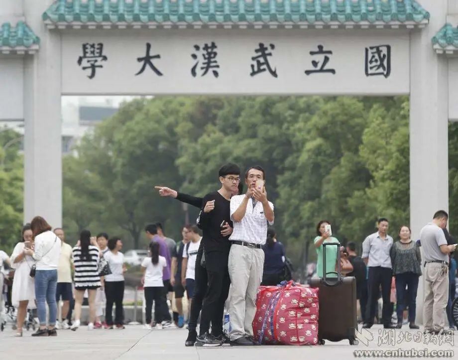 武大正门牌坊前,送新生的家长和孩子们一起合影留念。图自湖北日报网以下为采访文字实录: