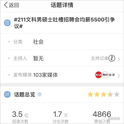 近期,“211文科男硕士吐槽招聘会均薪5500引争议”话题引发热议 社交媒体截图也不用减少文科生的招生数量,让学生自己去选择。选择的少了,数量自然就少了。