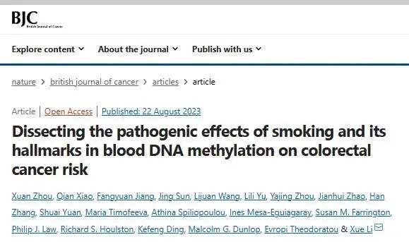 导读:该研究证实了吸烟和DNA甲基化与结直肠癌风险之间的显著关联,并对吸烟对结直肠癌风险的致病作用产生了新的见解。