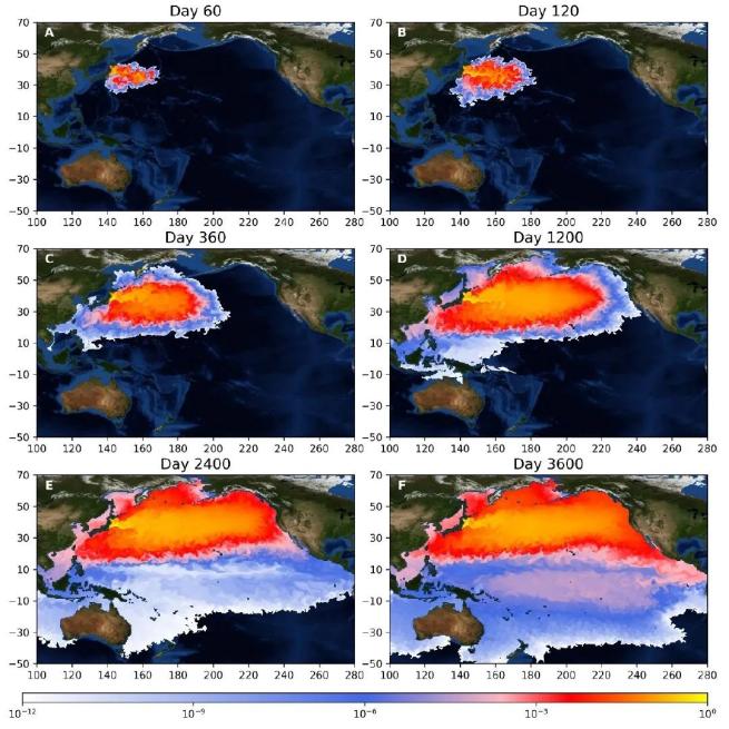 值得注意的是,尽管污染物的排放位置是在福岛附近,但随着时间的推移,污染物高浓度区域将沿着35°N线附近向东延伸,从开始的东亚附近海域扩散到北美附近海域。在第2400天时,中国东南沿岸海域主要呈现浓度较低的浅粉色,而北美西侧海域已经基本被浓度较高的红色覆盖。