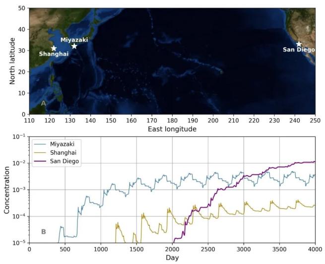 这一结果也意味着,在核废水排放的早期,应主要考虑它对亚洲沿岸的影响。但在后期,由于北美沿岸海域的污染物浓度将持续高于大部分东亚沿岸海域,需要重点关注北美沿岸海域的受影响情况。
