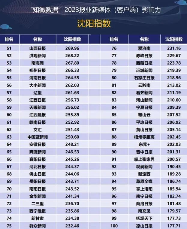 在8月23日举行的中国报业新媒体(客户端)发展大会上,城市新媒体影响力“沈阳指数”正式发布。“沈阳指数”覆盖范围包括全国180余家报业新媒体(客户端),采集2022年全年数据。澎湃新闻、中国青年报、南方+、大众日报等新媒体(客户端)入选2023新媒体(客户端)影响力Top100;成都发布、上海发布、南京发布、北京发布等城市发布入选2023中国城市发布影响力沈阳指数Top30。