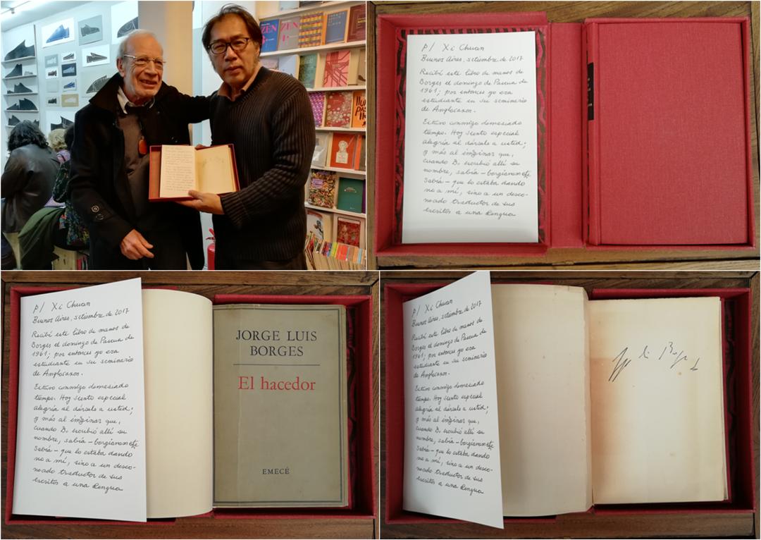 诗人西川拥有的博尔赫斯签名书1997年,西川去阿根廷参加新书首发式,现场观众中有一位老者在活动开始前,将博尔赫斯的签名书和一枚便签包在了红色盒子里送给西川。原来,这位老者名叫卡洛斯.R.路易斯,是位语言学家,也是博尔赫斯在60年代教过的学生。1961年,博尔赫斯将这本书送给路易斯时,有过一个未言明的愿望,就是希望这本书可以再经他转送给一位来自远方的说着奇怪语言的翻译者。路易斯认为,西川就是最佳人选。