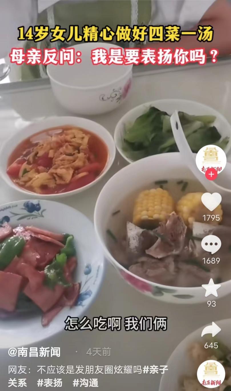 可当女孩满心期待,能看见妈妈的笑容,听到妈妈夸奖时。妈妈却冷冰冰地反问道:“我是要表扬你吗?你中午跟我整这么多菜,我们俩怎么吃啊?”