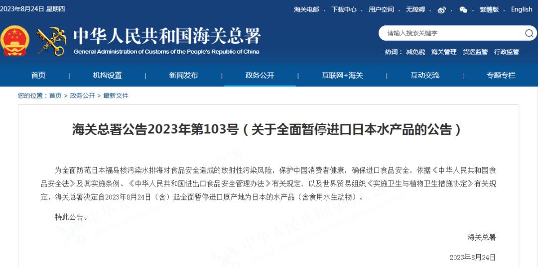 24日,海关总署网站发布《海关总署公告2023年第103号(关于全面暂停进口日本水产品的公告)》: