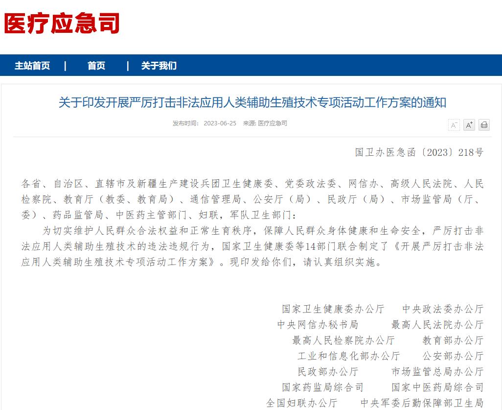 近日,国家卫生健康委、中央政法委等14部门联合印发了《开展严厉打击非法应用人类辅助生殖技术专项活动工作方案》,于2023年6月至12月在全国开展严厉打击非法应用人类辅助生殖技术专项活动,规范人类辅助生殖技术的应用,严厉打击由此引发的各类违法犯罪行为,切实维护人民群众身体健康和生命安全。