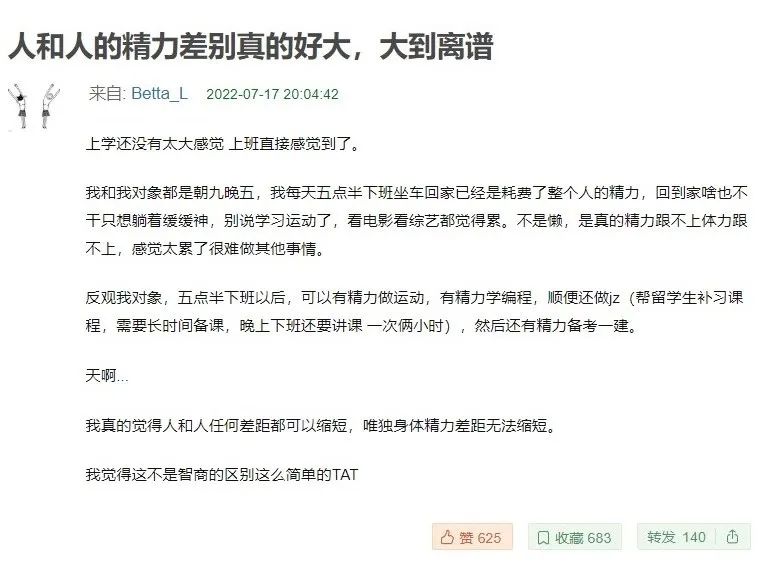 人和人之间的精力差别,有时候大到离谱:同是朝九晚五,有人下班后只想躺着缓缓,看综艺都觉得累,也有人还能去做运动、学编程、做兼职……