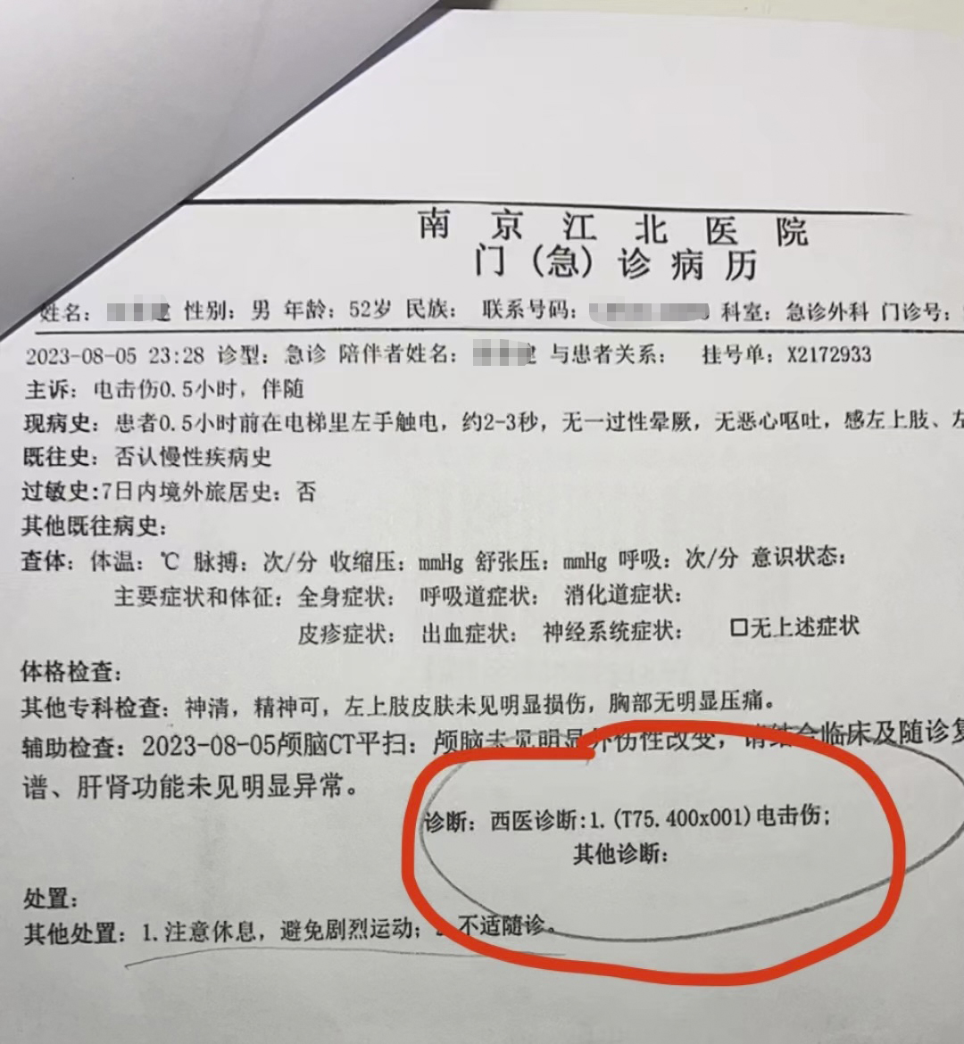 雍女士说,随后警察赶到现场,要求商场安排人员陪同他们夫妻去医院,但未果。警察将宋先生送到了医院。当晚,南京江北医院门(急)诊病历显示,宋先生被诊断为“电击伤”,处置为:注意休息、避免剧烈运动、不适随诊。