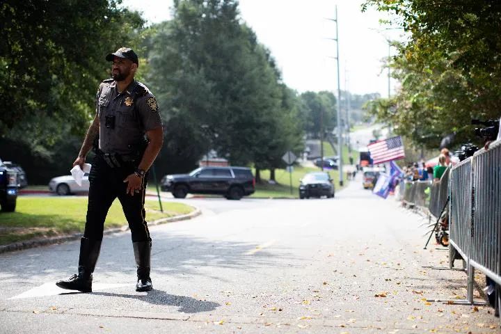 8月24日,警察在美国佐治亚州亚特兰大市富尔顿县拘留所外警戒。美国前总统特朗普24日就涉嫌推翻2020年总统选举佐治亚州结果向该州司法当局自首。新华社发(马修·彭德里 摄)