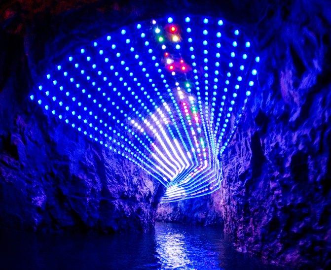 洞内景观粗旷、钟乳怪诞,如刀劈似斧削,潭深水幽、曲折神密、水幕电影、光怪陆离,船行其中恍如“时光隧道”,妙趣横生。