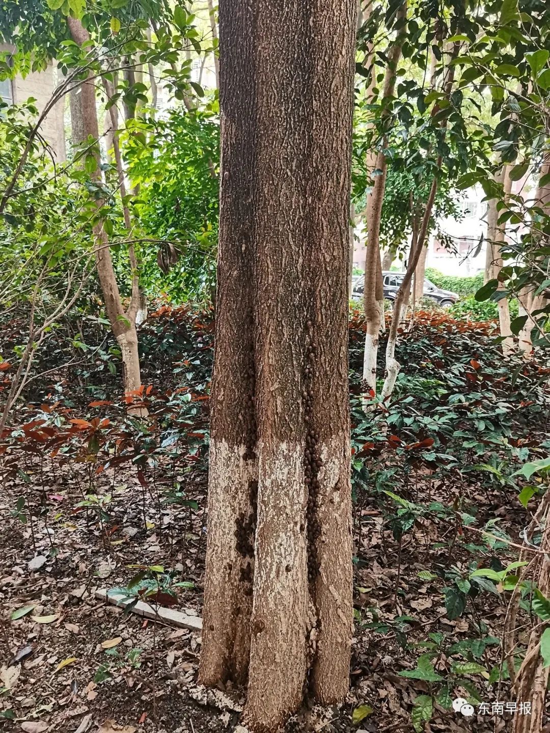 在公园保安亭靠万厝埕公寓一侧的花围,记者看到了林先生反映的情况。只见花围里一二十棵大树的底部树干都被蜗牛附着,每棵树的树干上都附着着几十只或上百只蜗牛,这些蜗牛有的如小孩拳头大小,有的如花生粒大小。