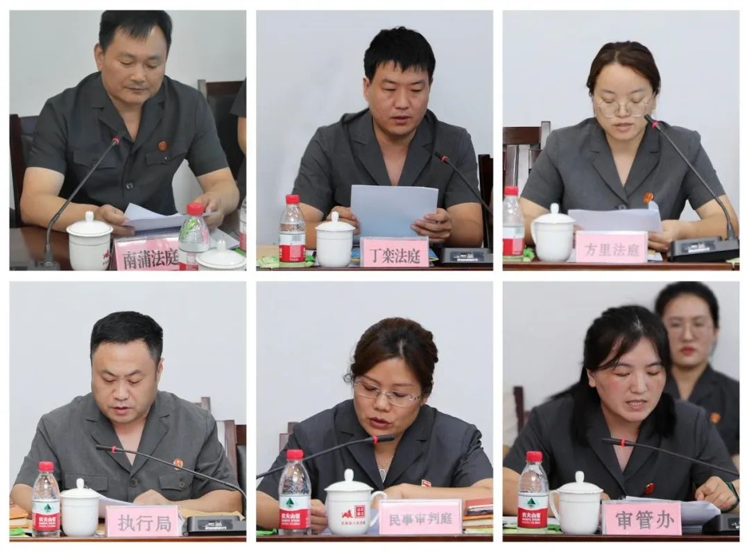南蒲法庭、丁栾法庭、方里法庭、执行局、民事审判庭、审管办负责人分别通报《起重行业案件报告》《卫材行业案件报告》《防腐行业案件报告》《房地产行业案件报告》《建筑行业案件报告》《长垣市人民法院关于优化法治化营商环境服务民营企业高质量发展的若干措施(征求意见稿)》。