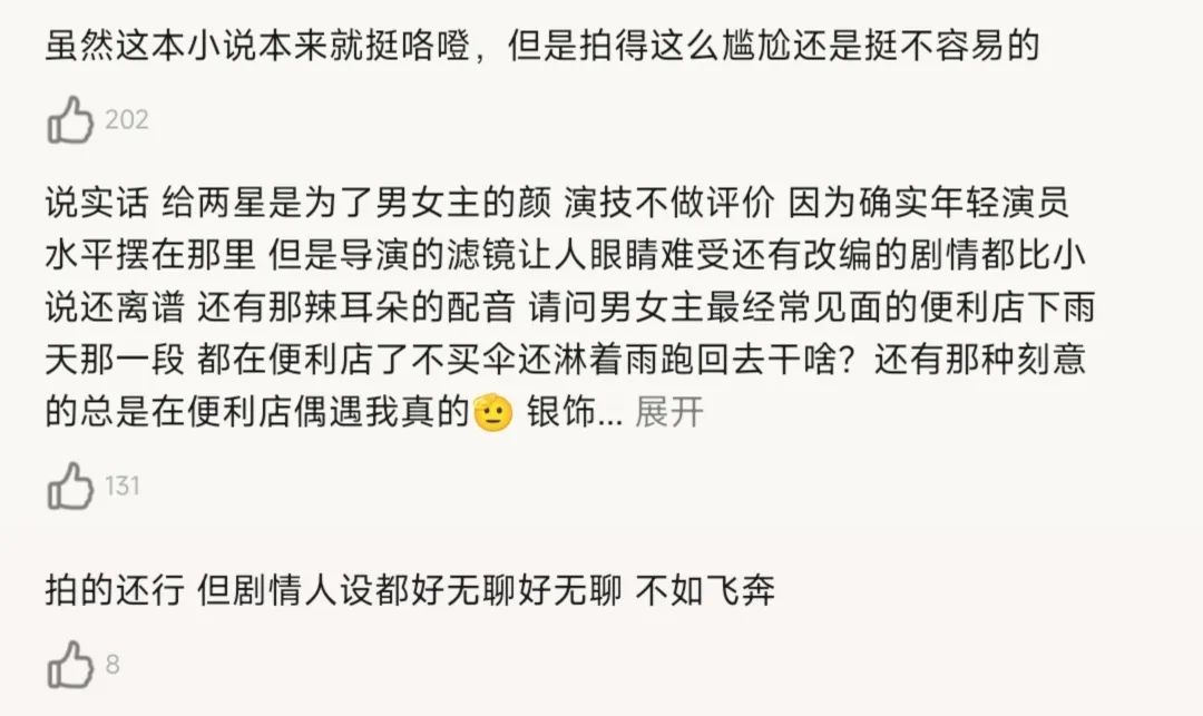 男女主演技捉急,剧情低幼敷衍像过家家,剧情在轻喜剧与正经剧情中反复横跳……都让网友们直呼观感不佳。