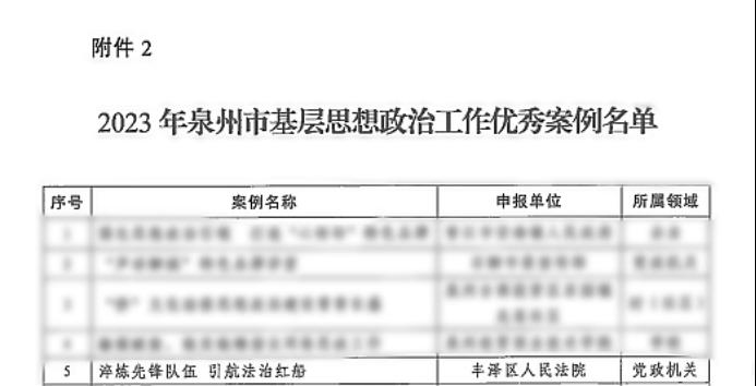 近日,泉州市委宣传部公布2023年泉州市基层思想政治工作示范点和优秀案例评选结果,丰泽法院报送的《淬炼先锋队伍 引航法治红船》获评2023年度泉州市基层思想政治工作优秀案例。