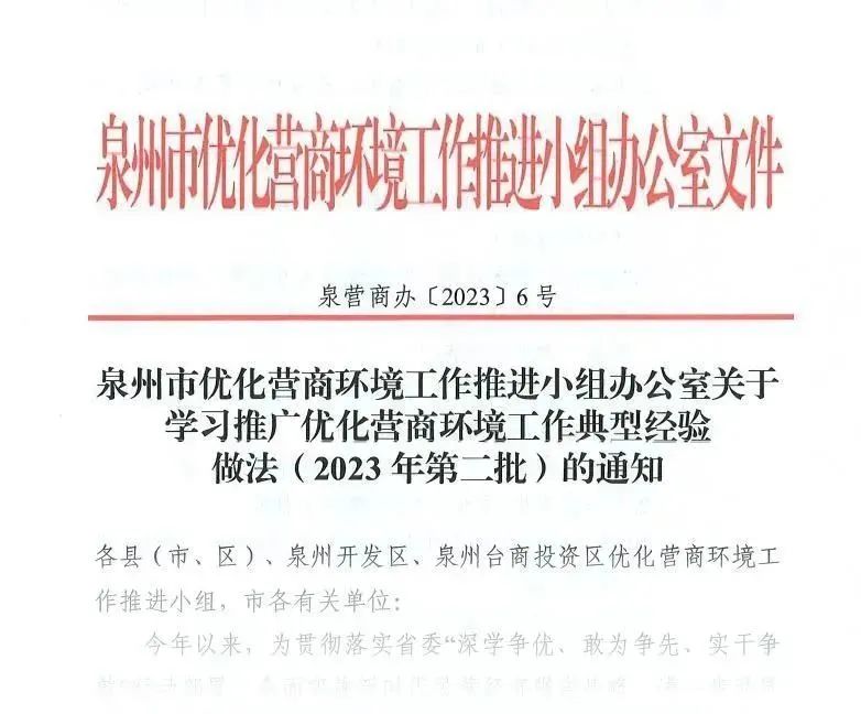 8月21日,泉州市营商办发布《关于学习推广优化营商环境工作典型经验做法(2023年第二批)》,《晋江法院“场景式”宣教激发诚信“正能量”》获评入选,在全市推广。