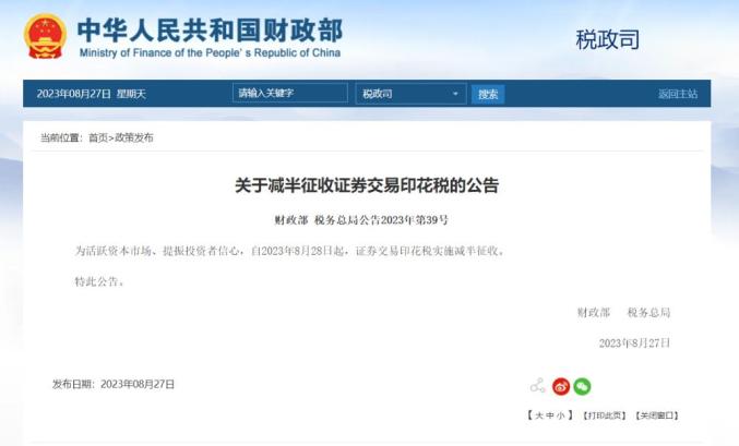 财政部、税务总局发布公告,自2023年8月28日起,证券交易印花税实施减半征收,公告全文如下: