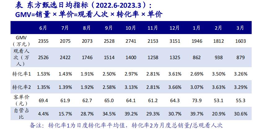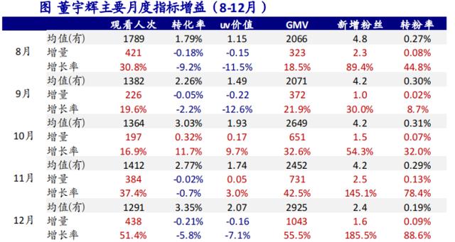 以董宇辉为代表的主播们探索出了一种差异化的直播风格,也让市场看到了电商带货的更多可能与想象。东方甄选直播间由此走红,坐上流量火箭,一举成为抖音顶流。新东方也因此在今年3月发布公告,将业务发展方向写进了新的股份简称中(EAST BUY/东方甄选)。在较长一段时间里,坊间很乐于讨论董宇辉对直播间的贡献。东方甄选出圈走红,董宇辉的作用有目共睹,但用数据来说明可能更具象一些。据海通国际证券统计,2022年8-12月,董宇辉对于东方甄选的观看次数、GMV的提升均有明显的带动作用。以2022年12月1日-31日数据测算,董宇辉直播日中GMV均值增长55.5%。