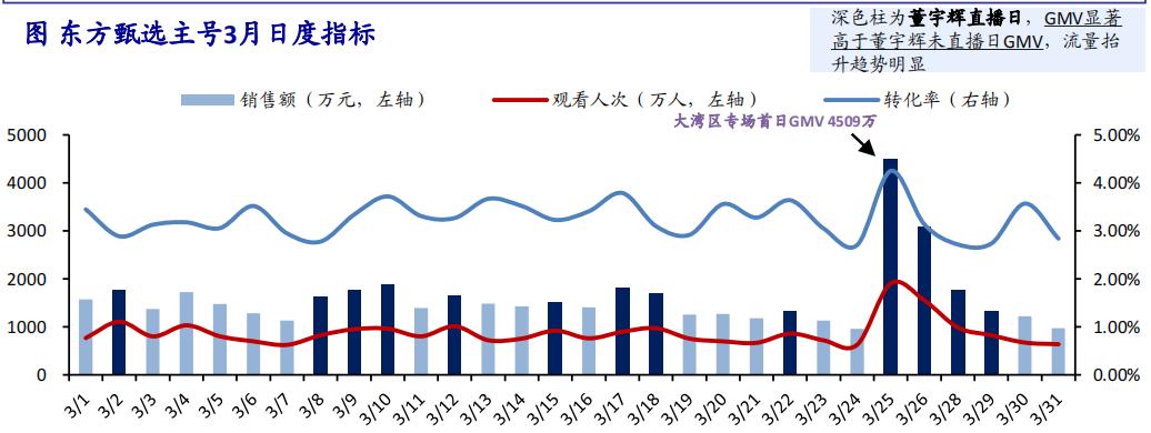 到今年3月,董宇辉直播日观看人次均值为950万,增长31.6%,GMV均值为1745万,增长率为35.8%,显著高于董宇辉未直播日GMV。