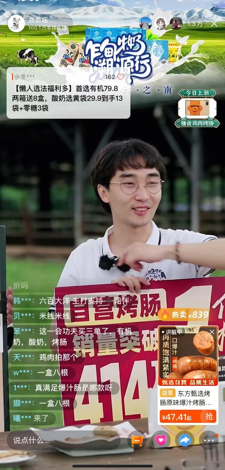 财报显示,东方甄选目前已开发超过120款自营产品,其2023财年自营产品总营收超过26亿元。在今天的直播中,有主播提到自营烤肠目前已经突破414万单,累计售出超1亿根。而稍早前的1月,东方甄选曾宣布投资1752万元用于自营烤肠工厂的扩建。