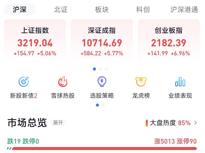 其中,沪指高开5.06%报3219.04点,深证成指高开5.77%报10714.69点,创指高开6.96%报2182.39点。截至午盘,沪指涨2.3%,深成指涨2.38%,北证50涨1.93%,创业板指涨2.54%。沪深两市半日成交额7776亿元。两市超4700只个股上涨,北向资金半日净卖出43.05亿元。板块题材上,房地产开发、核污染防治、证券等板块涨幅居前,两市仅贵金属板块飘绿。