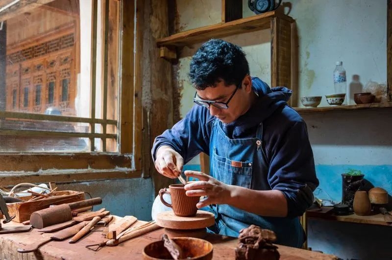 想要深入了解黑陶制作技艺,走进汤堆村是最直接的方式。在鲁茸恩主家的黑陶工作室里,四位来自上海的青年男女正在对手中的泥胚进行塑形,鲁茸恩主在旁传授着塑形的技巧。自从成立了工作室,鲁茸恩主每年都要接待来自全国各地的游客前来体验黑陶制作技艺。汤堆村有很多黑陶技艺体验工坊,在工坊里,可以近距离观察制陶人的工作过程,感受他们对泥土的驾驭和情感的投入。从原材料的选择到成品的呈现,每一个环节都是一次精湛技艺和智慧的体现。亲身体验一次黑陶制作技艺,与陶土亲密接触,感受泥土在手中的温度和质感,每一次轻捏、拉拽,都是对艺术的深刻思考和情感的投入,让人与艺术更加亲近。