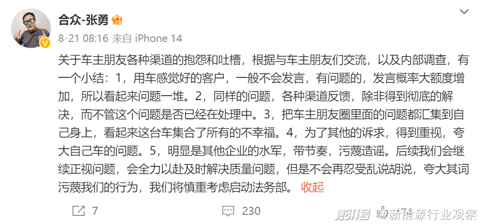 而在8月21日,造车新势力哪吒汽车CEO张勇在社交平台表示,“将慎重考虑启动法务部”,也引发网友热议。