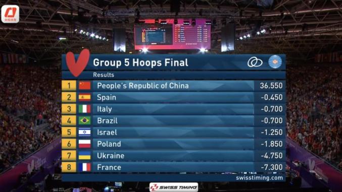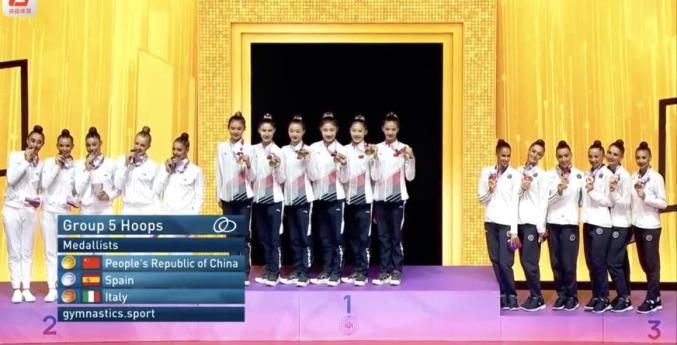 在最后一日集体单项决赛里,由沙坪坝小花丁欣怡与郭崎琪、郝婷、王澜静、蒲彦竹组成的中国队在充满中国元素的《水龙吟》与《破阵乐》音乐曲目中,以36.550分获得5圈单项金牌,这是中国艺术体操队首次拿到世界冠军。由郭崎琪、郝婷、黄张嘉洋、王澜静、蒲彦竹组成的中国队在《蝴蝶与飓风》的音乐声中,以32.800分获得3带2球单项银牌。