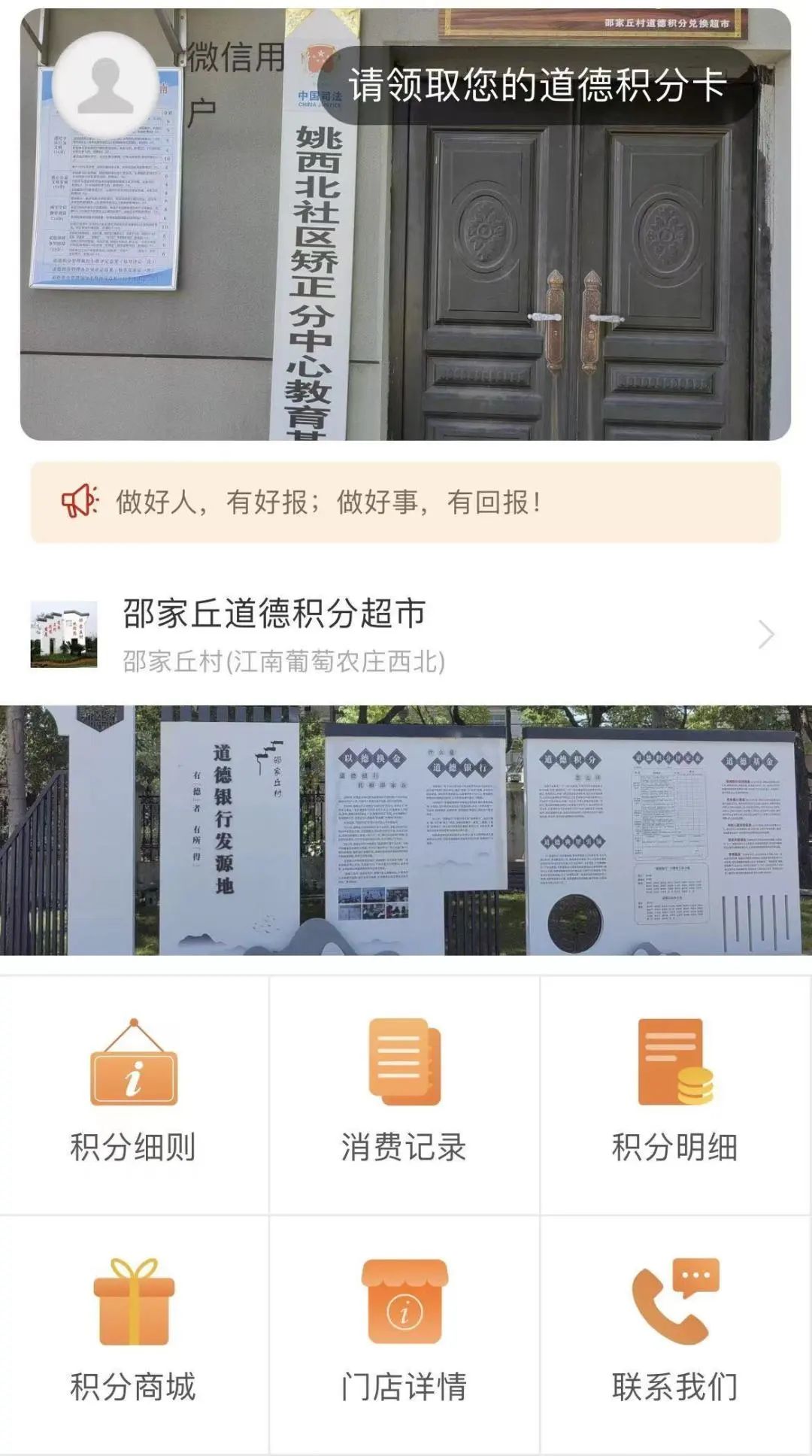 线下的“道德积分超市”。“推出‘道德积分超市’,旨在让‘做好事、有积分,做好事、有回报’的意识深入人心。”姜海军说,邵家丘村是“道德银行”发源地,先后获评全国文明村、浙江省美丽乡村特色精品村、浙江省第二批未来乡村等荣誉,做好事在村里已蔚然成风,但持续改善民风,提升村民荣誉感的措施还要继续实施。